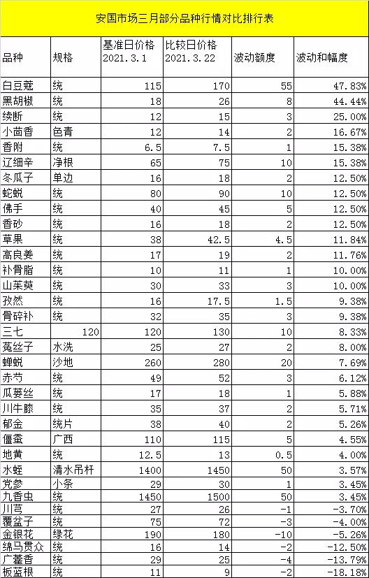 事實(shí)上,除了亳州藥材市場(chǎng),安國藥市也有多種品種行情上揚(yáng)。例如草果、郁金、黑胡椒、白豆蔻等。