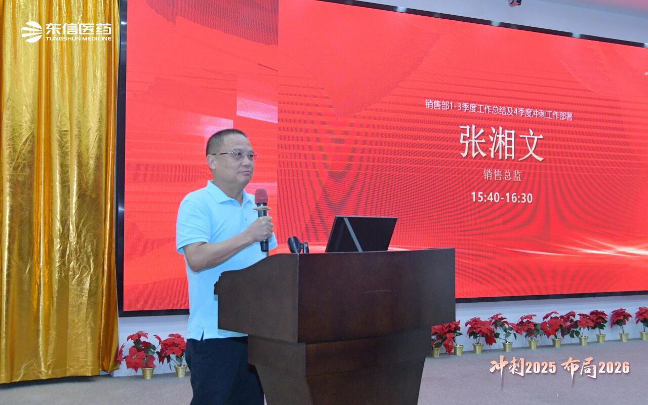 銷售總監張湘文全面總結銷售部前三季度的業績達成情況,并針對多項重點工作提出具體要求:一是確保完成四季度任務目標;二是穩步推進五大工程落地;三是有序開展秋季PK活動;四是推動區域重點產品實現深度突破;五是加大OTC產品推廣力度;六是落實省際聯盟集采相關工作;七是科學制定2026年銷售計劃。